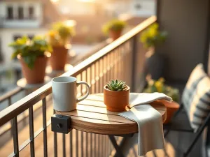 Bardzo praktycznym rozwiązaniem są stoliki montowane do balustrady. Mają one regulowane uchwyty, dzięki czemu dopasujesz je do większości standardowych barierek. Po rozłożeniu tworzą stabilny blat, na którym zmieści się talerz, kubek kawy albo laptop, a po złożeniu opadają pionowo i zajmują zaledwie kilka centymetrów.